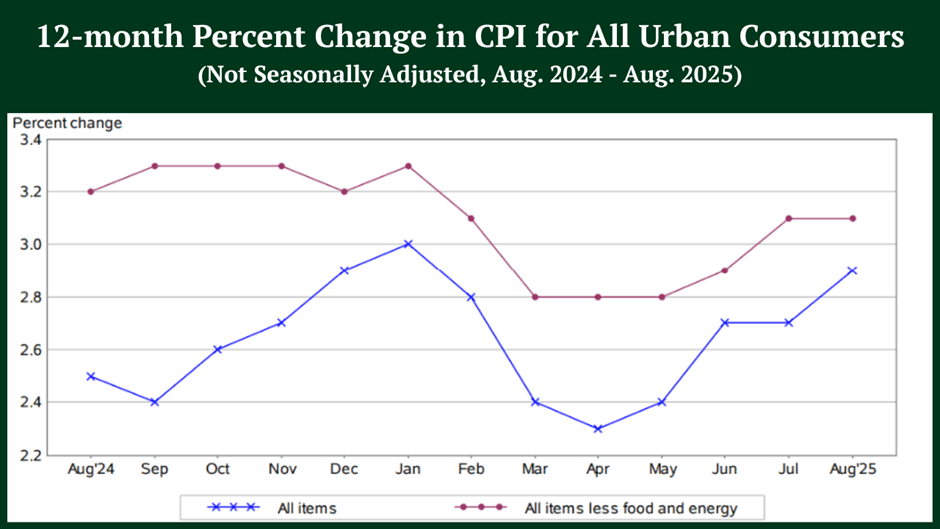 U.S. inflation data released during the week of September 8-14, 2025, highlighted the persistent challenge facing the Federal Reserve. The Consumer Price Index (CPI) rose 2.9% year-over-year in August, up from 2.7% in July, while core CPI held steady at 3.1%, reflecting sticky underlying price pressures. On a monthly basis, headline CPI increased by 0.4%, with core CPI climbing by 0.3%, underscoring that inflation remains entrenched despite signs of slowing growth.