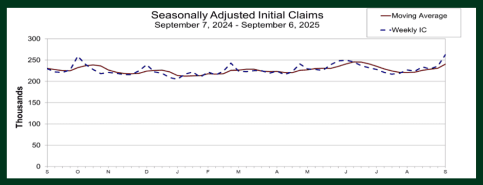 Labor market developments during the week underscored clear signs of cooling, putting pressure on the Fed’s timeline for rate cuts. On September 11, 2025, the Labor Department reported that initial weekly jobless claims surged to 263,000 for the week ending September 6, 2025, up by 27,000 from the prior week and marking the highest level since October 2021.